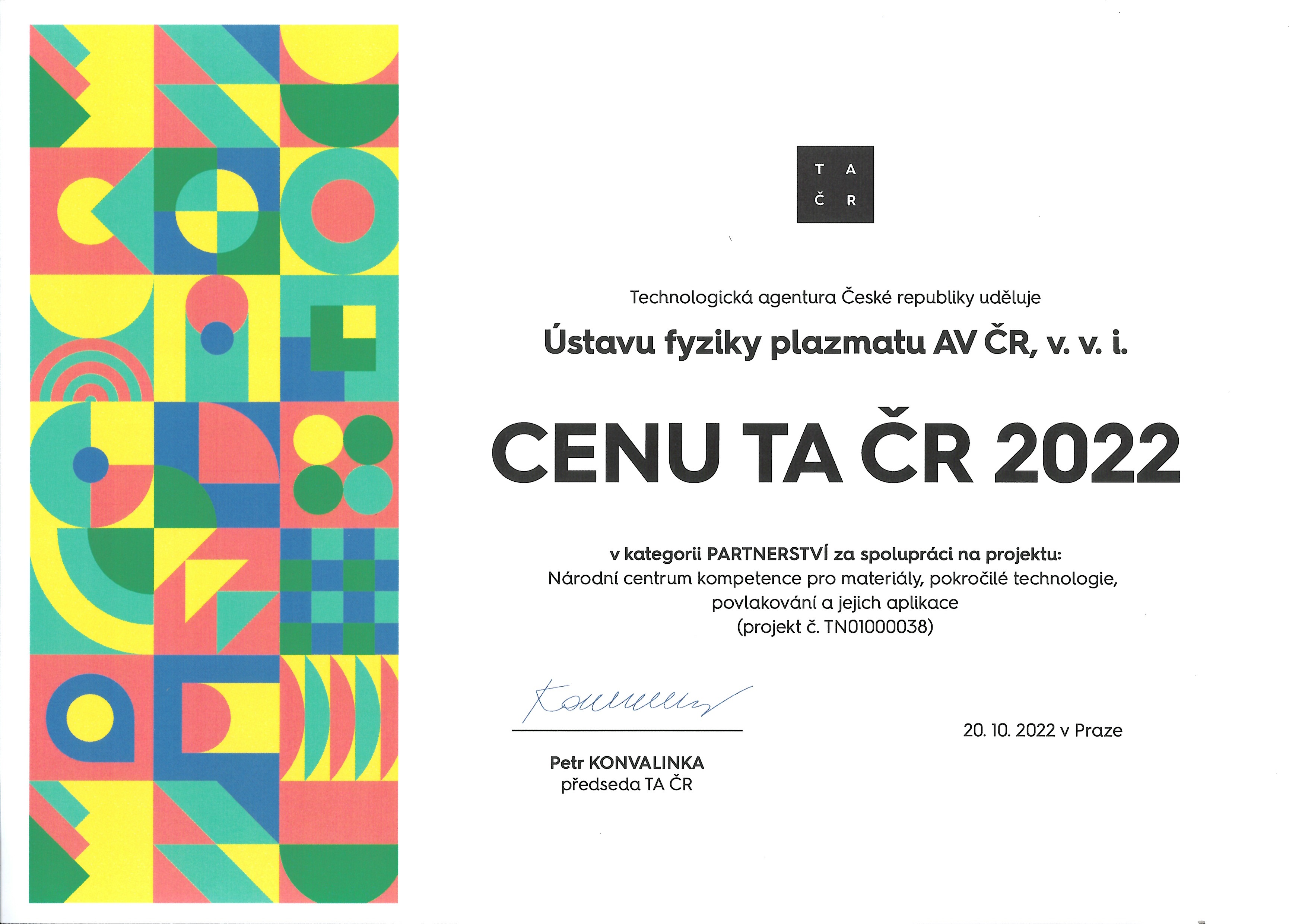 IPP won the TA CR 2022 award for its participation in the National Centre of Competence for Materials, Advanced Technologies, Coating and their Applications (NCK MATCA for short).